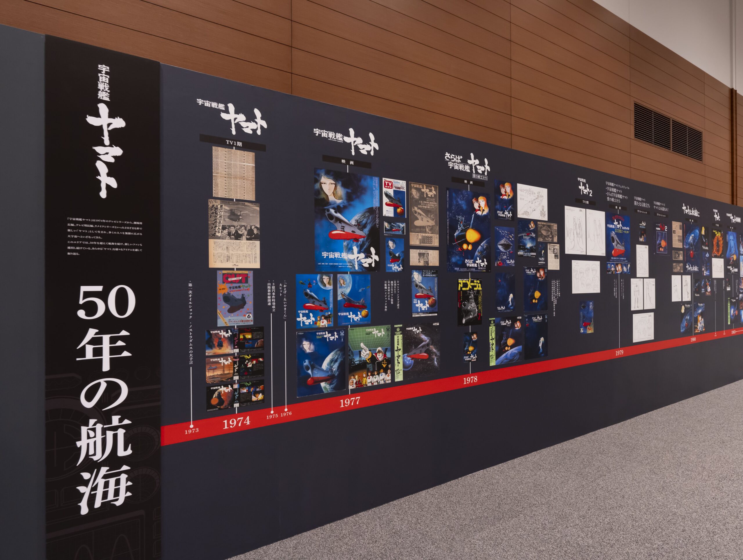 本企画展は、「『宇宙戦艦ヤマト』との出会いがなければ、今の自分はなかった」と語る庵野秀明氏が企画・プロデュースを手がけ、当時の企画書をはじめ、キャラクターやメカニックの設定画、原画、背景画など厳選された貴重な資料2,000点以上が集められました。ヤマトシリーズ50年の歴史を振り返る大年表空間や楽曲紹介、巨大ヤマト艦の模型に、当時の商品の展示など、日本が世界に発信する”アニメ文化”の礎となった『宇宙戦艦ヤマト』の魅力を、作品の流れにそってお楽しみいただく内容となりました。